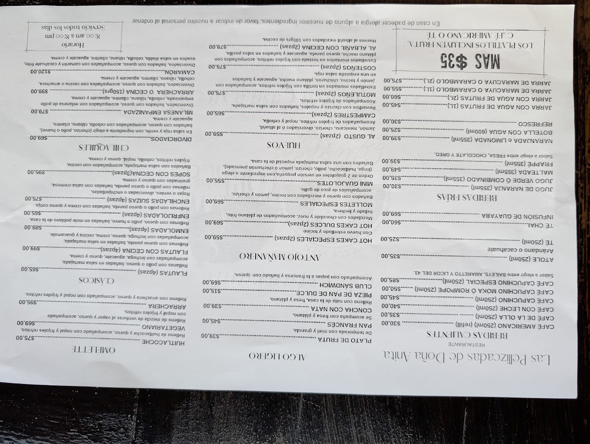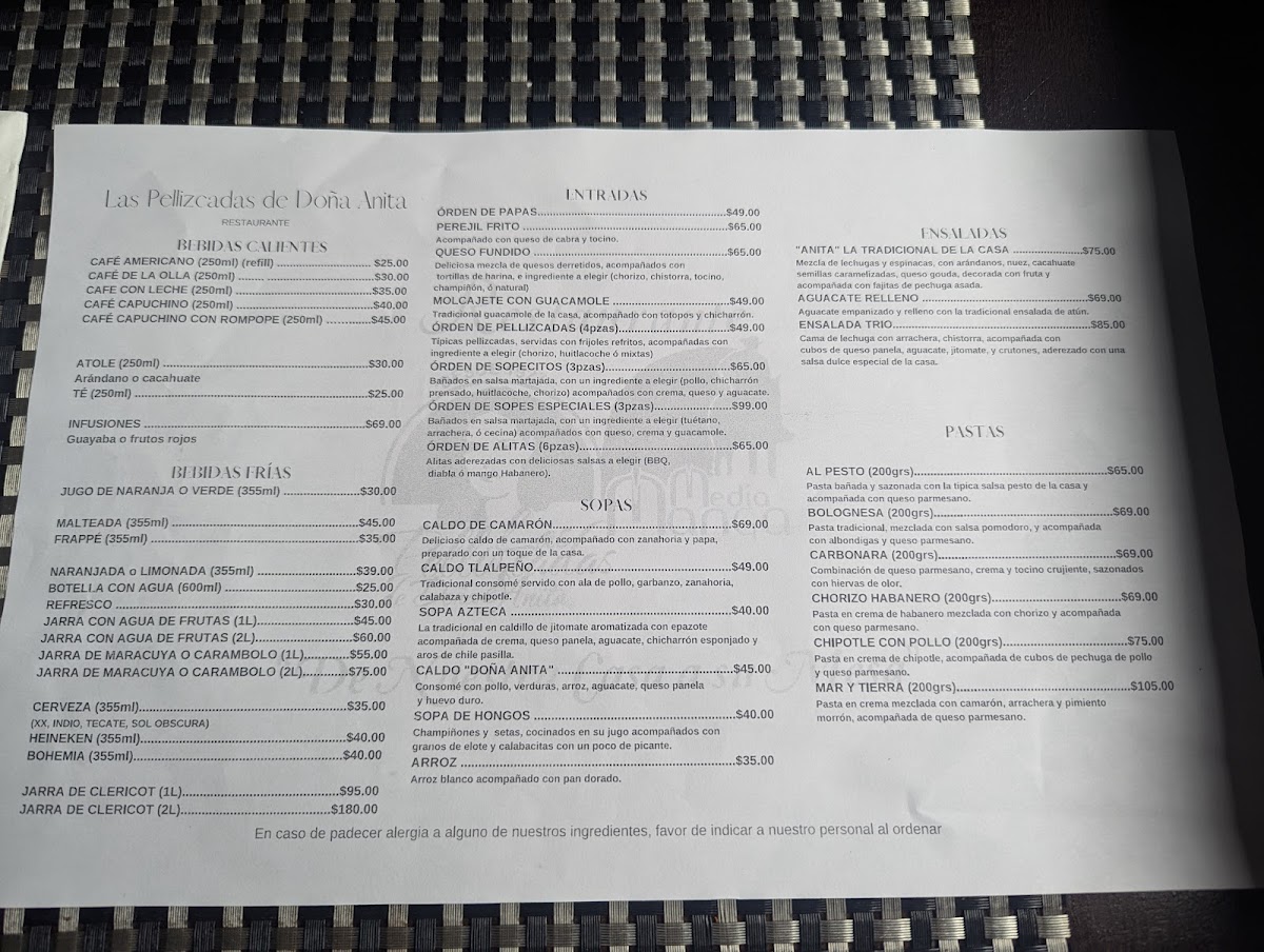 The menu at Las Pellizcadas de Dona Anita features a variety of Mexican dishes organized into several key categories. Visitors can find traditional main courses such as platos clásicos including enchiladas, flautas, and enfrijoladas, each served with different protein options and regional sauces. The egg dishes section offers a range of preparations like huevos al albañil, huevos costeños, and huevos campestres, often accompanied by sides like nopales and refried beans.