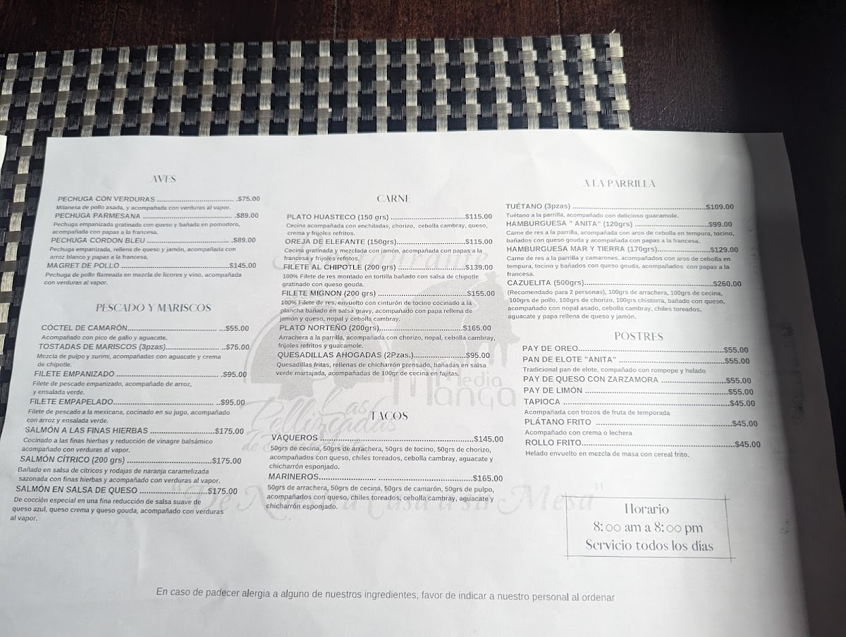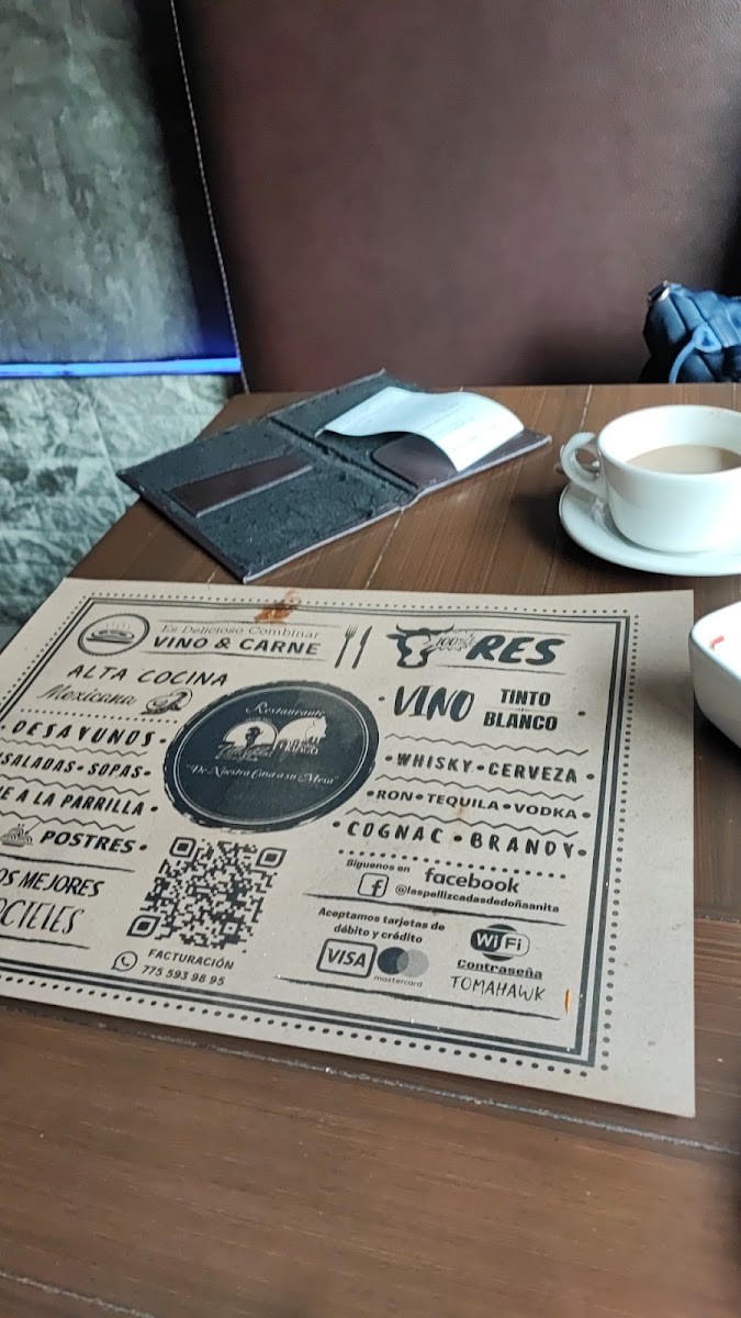For those looking for a combination of items, there are combo meals available that typically include sweet or savory options paired with beverages such as café de olla. The menu also includes a selection of soups and specialties like Sopa Azteca, Tuétano, and various preparations involving chicken, beef, and seafood, including pasta dishes like Espagueti a la Boloñesa and Pasta Mar y Tierra.